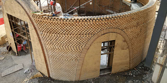 建筑外部的纹理设计很像地质学上的断层剖面,这使整个建筑犹如破土而出。有意思的是,这还是一块摔“掉碴”的方砖:它的檐口是残破的,设计师称之为“敲边”,是故意留下的“痕迹”。