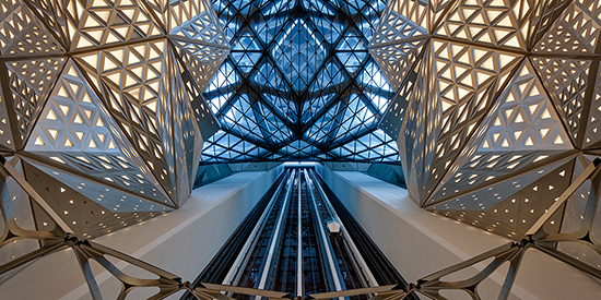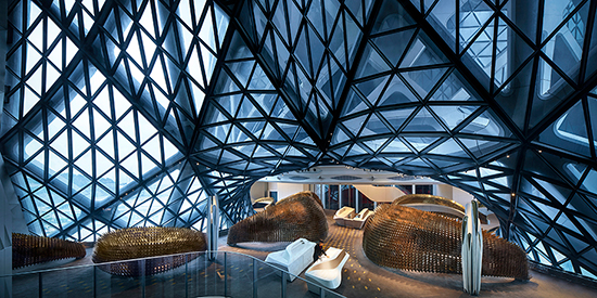 进入建筑内部,宛如掉进了蜘蛛精的盘丝洞。错综复杂的白色网状内突结构,给人以极大的视觉冲击力。站在35米挑高的大堂中央,抬头即可清楚窥探到底部镂空的廊桥设计,而乘坐两侧的通顶观光梯,还能一探“盘丝洞”的“腹内”全貌。