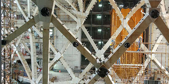 本来中规中矩的立方体中部被挖成“8”字镂空造型,暴露在外的网状结构攀附在楼体表面。镂空的设计以玉璧为灵感,大胆前卫,造型独特。而扒掉繁复的外壳,该建筑实则是两个圆柱形塔楼作为核心结构,并由中央廊桥连接而成。