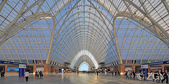 其中,国际展览中心是园区占地面积最大的联排建筑群,二十四个仿“琅琊台”造型方顶被巨大的十字展廊分成四区。